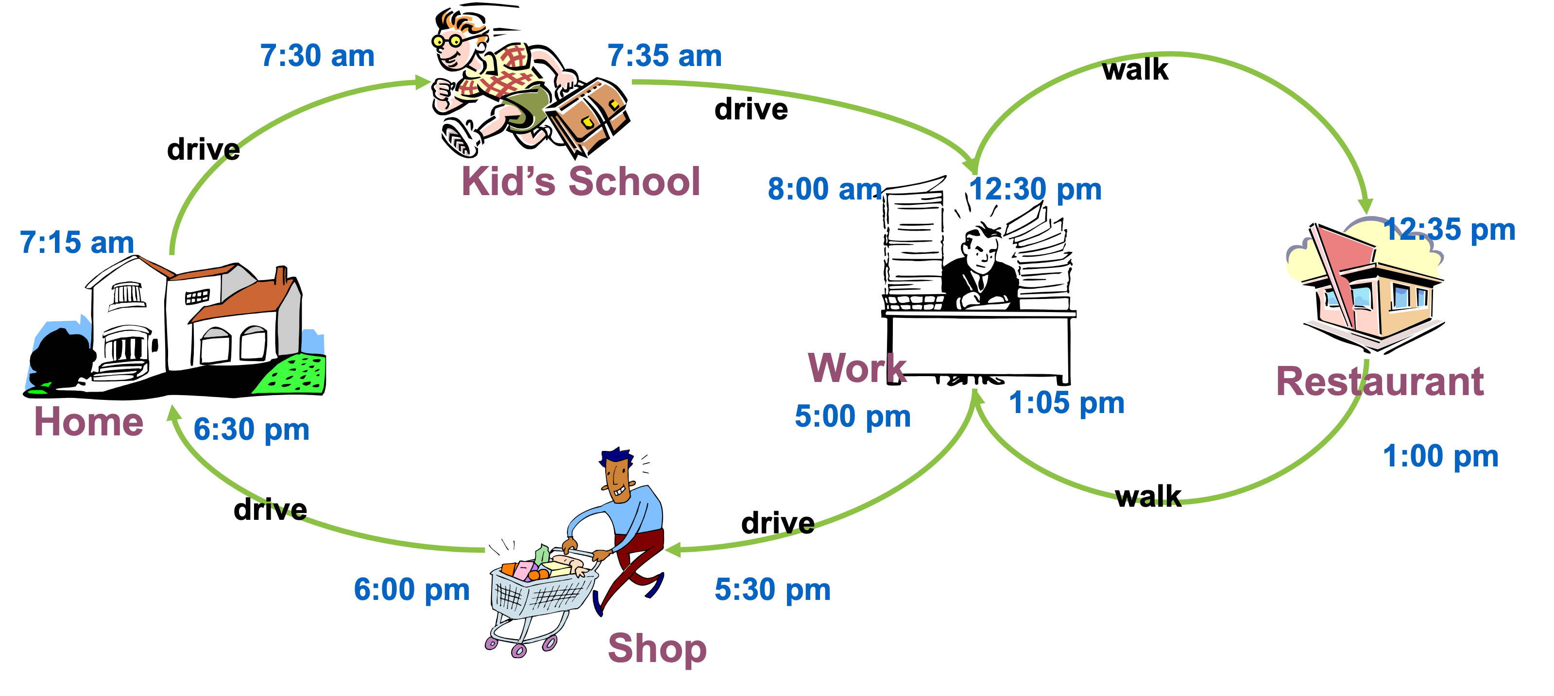 Example: Daily activity-travel pattern of an individual. Source: Chandra Bhat, “General introduction to choice modeling”