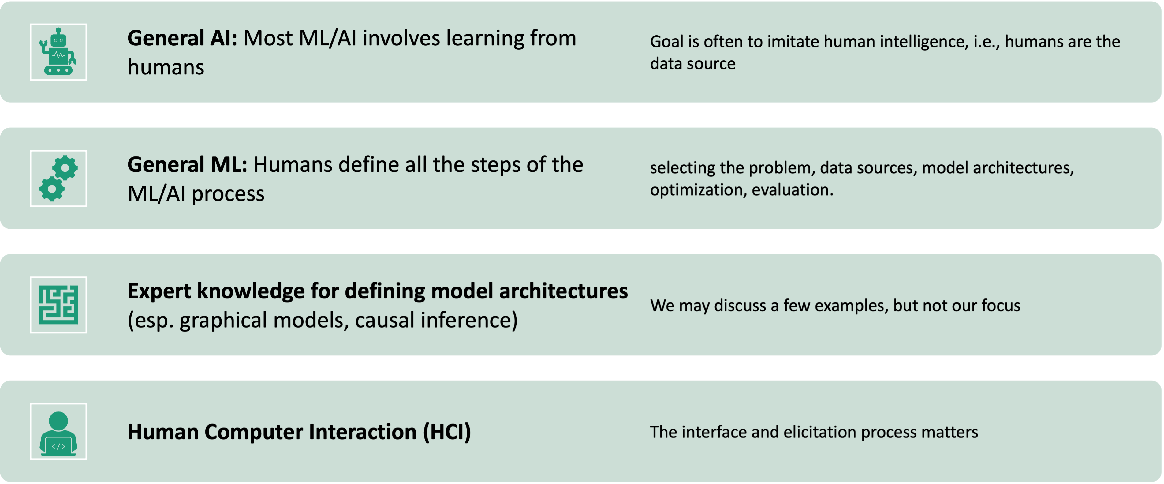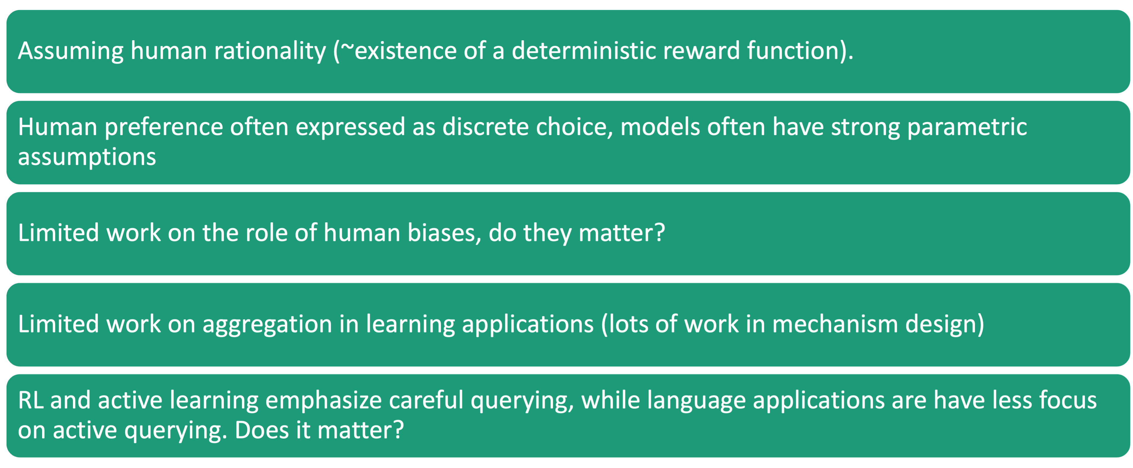 | Part 2: Learning | How to learn from and act on preferences | Ch 2: Learning, Ch 3: Elicitation, Ch 4: Decisions |
