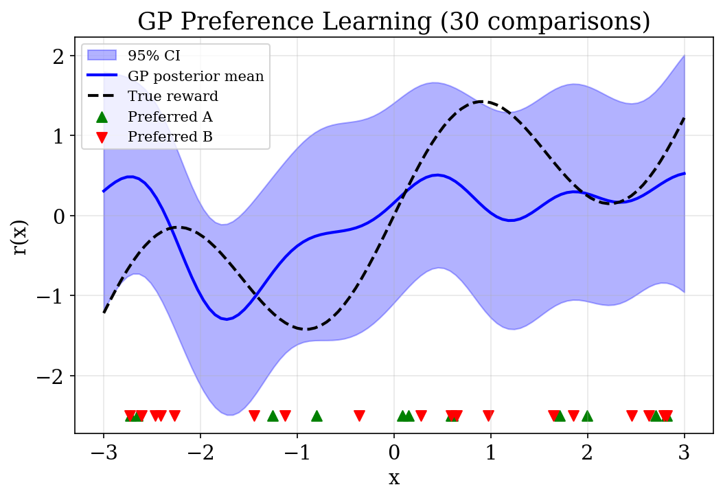 \[ \mathbf{r}^* = \arg\max_{\mathbf{r}} \sum_{i=1}^n \log \sigma\bigl(y_i(r(x_A^{(i)}) - r(x_B^{(i)}))\bigr) - \tfrac{1}{2}\mathbf{r}^\top K^{-1}\mathbf{r} \]