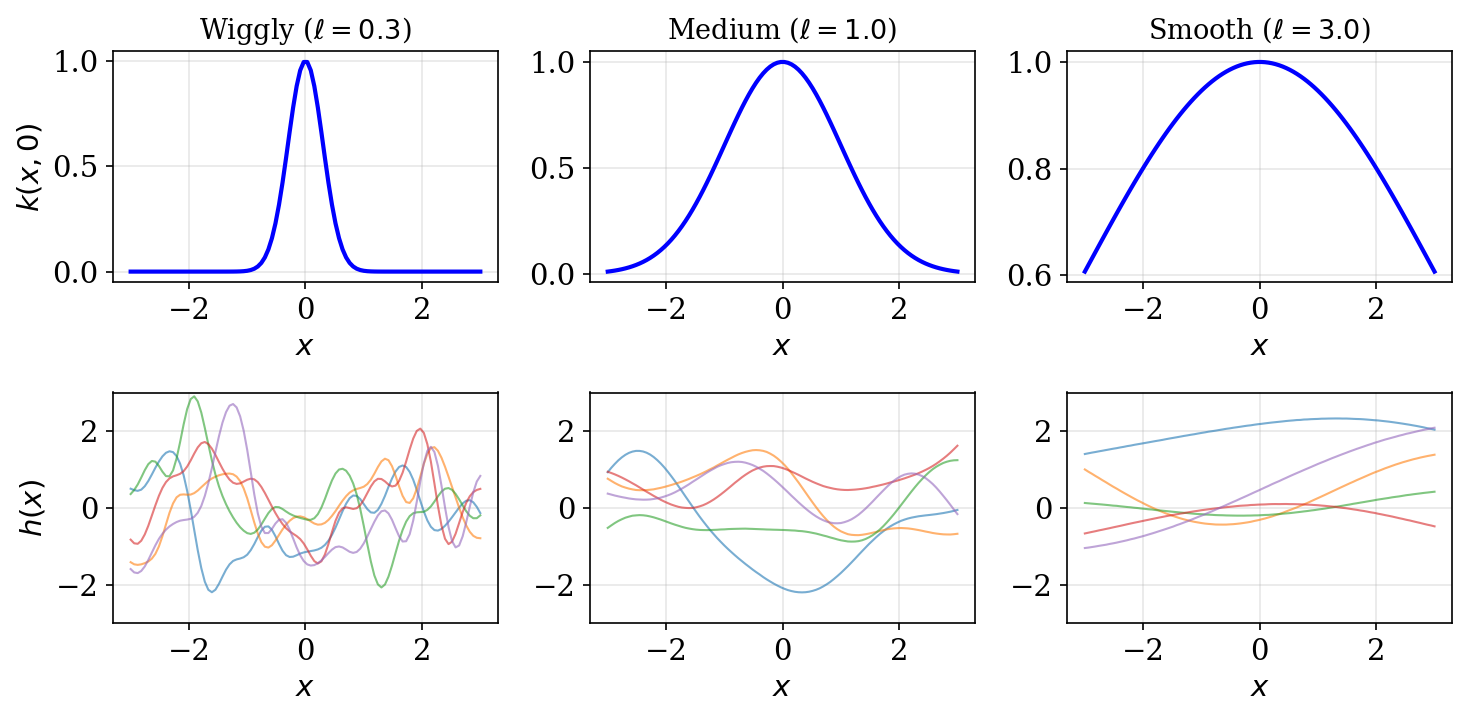 - \(\ell\) (lengthscale): controls smoothness — small \(\ell \Rightarrow\) wiggly, large \(\ell \Rightarrow\) smooth