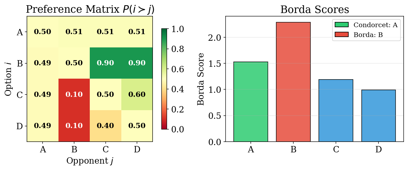 - Copeland score: measures how often an option wins; the Condorcet winner = optimizer